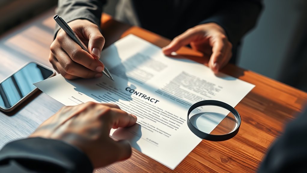 Ultimately, it’s about being vigilant and proactive. Don’t let legal jargon intimidate you into skipping over details. Instead, arm yourself with knowledge and ask questions. When it comes to contract duration, plan ahead to guarantee your obligations align with your intentions. Taking these steps can help you avoid the common pitfalls that trap many signers into unfavorable terms. Remember, a contract is a binding agreement—so it’s worth your time to scrutinize every clause carefully before you sign on the dotted line. This way, you protect yourself from hidden pitfalls that could cause problems later and guarantee that the agreement works in your best interest.