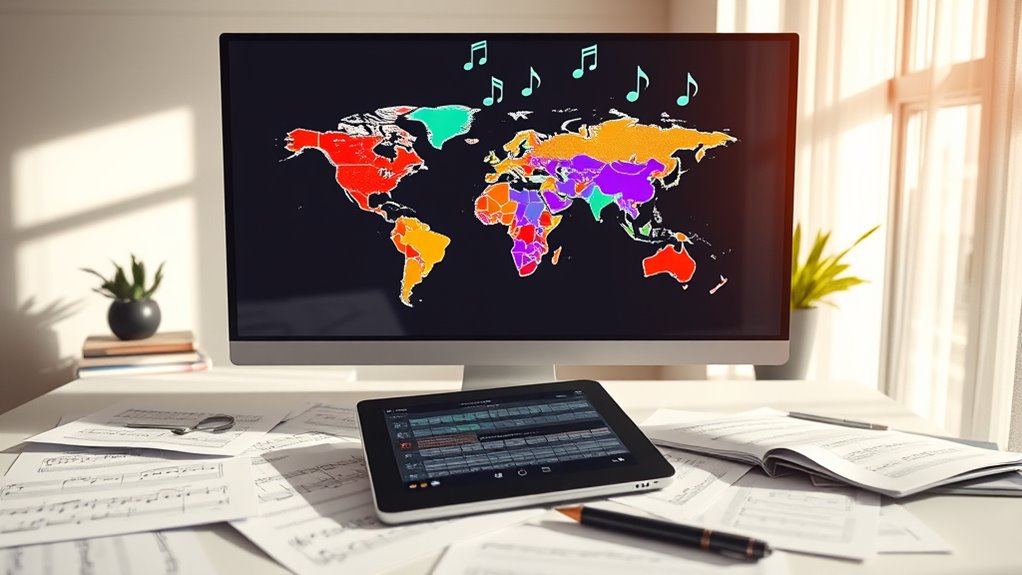 Furthermore, global registration isn’t just about compliance; it’s about maximizing your income. When your works are registered across various territories, you open the door to royalty collection from a wide array of sources—broadcast, online streaming, live performances, and more. This process can be complex, but with the right support, you can focus on creating music while your administration team handles the legal and logistical details. They’ll keep track of where your music is being used worldwide and ensure your performance rights are enforced everywhere. Additionally, understanding the importance of proper registration can significantly impact your royalty income. Ultimately, proper registration and diligent royalty collection are vital to turning your creative efforts into reliable income.