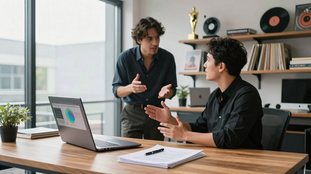 Imagine opening a treasure chest of endless opportunities! With publishing administration, you gain long-term benefits like flexible contract durations and control over royalty structures, letting you adapt as your career grows. A publishing deal often offers immediate exposure, but it can confine you into rigid contracts. Both options shape your future, but choosing wisely guarantees sustained success, growth, and the freedom to steer your musical journey.