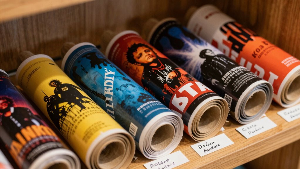 You should use acid-free materials like archival-quality folders or tubes for storing your posters. Rolling your posters carefully helps prevent creases and tears, but make sure to roll them loosely to avoid damage. Using acid-free tissue paper inside the tube adds extra protection and prevents sticking. These materials guarantee your posters stay vibrant and intact over time, making your collection safe from deterioration.