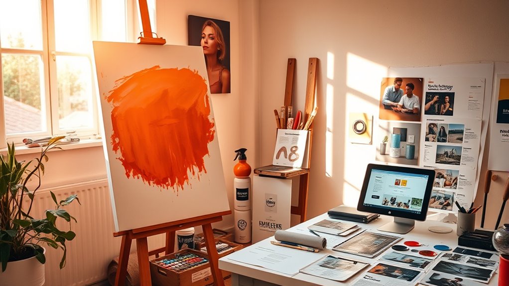 To stay authentic while marketing your art, focus on aligning your branding with your core values and unique voice. Share genuine stories behind your work and avoid chasing trends that don’t fit your style. Use platforms that suit your style and keep your messaging honest, emphasizing your creative journey. Striking this balance builds trust and long-term connection with your audience. Keep exploring how to maintain your integrity while promoting your art effectively.