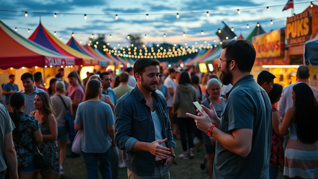 Think of networking at festivals as steering a lively river—you don’t want to rock the boat. Avoid common mistakes like interrupting conversations, seeming overly enthusiastic, or only talking about yourself. Instead, listen actively, be genuine, and respect others’ space. Don’t forget to follow up graciously. These small moves help you steer clear of rough waters, making meaningful connections that flow naturally and leave everyone feeling appreciated.