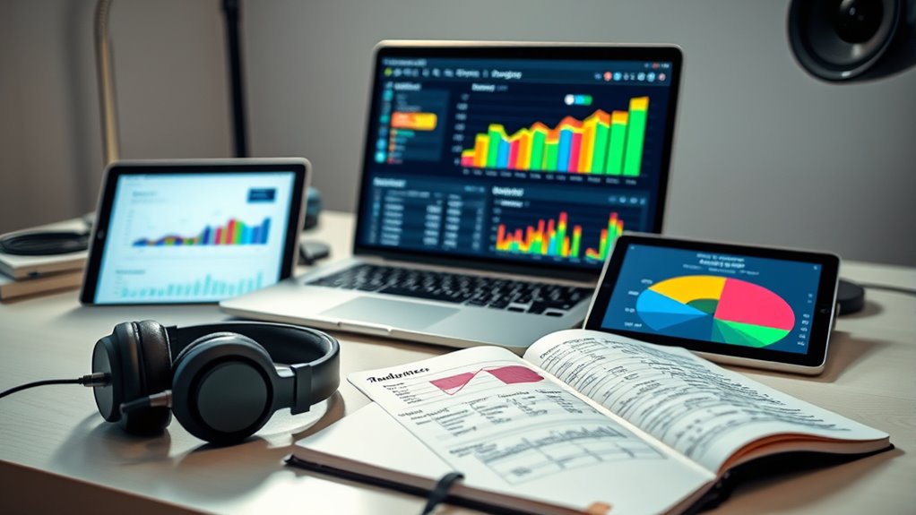 Tracking key metrics is essential for making your marketing efforts data-driven and effective. By monitoring audience engagement, website traffic, social media activity, and streaming stats, you can identify what resonates most with your fans. Segmenting your audience helps target your messaging and boost response rates. Using these insights, you can refine your strategies, increase engagement, and maximize your promotional ROI. Keep exploring to discover how to implement these techniques and turn data into growth.