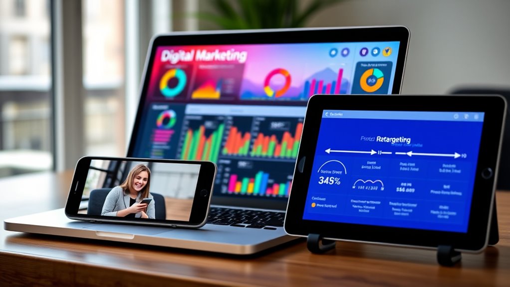 Paid advertising with targeted video ads and retargeting helps you reach the right audiences and boost engagement. You can segment your viewers based on demographics, interests, or behaviors, then personalize content to increase conversions. Retargeting reconnects with those who’ve interacted before, keeping your brand top-of-mind. By monitoring performance and adjusting your budget, you guarantee every dollar is spent effectively. Keep exploring to discover how these strategies can transform your advertising results.