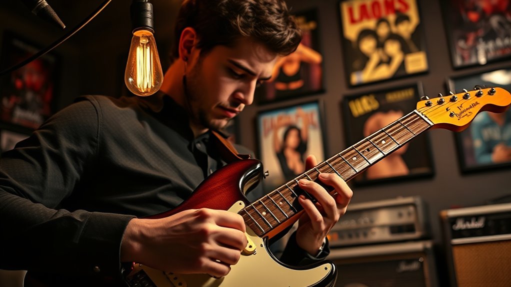 To build a personal brand as a session guitarist, focus on defining your unique musical identity and showcasing your skills with high-quality videos and recordings. Create a professional online presence by curating your profiles and sharing versatile content that highlights your sound and techniques. Network actively, collaborate, and gather client testimonials to boost your credibility. Developing a consistent style and engaging with industry contacts will help you stand out—keep exploring these strategies for deeper insights.