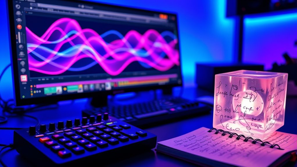 Generative music combines algorithms, rules, and randomness to create unique, real-time compositions that feel spontaneous. You can set parameters like tempo, harmony, or rhythm, allowing the system to improvise and adapt dynamically. By balancing structure with unpredictability, it produces fresh sounds that evolve continuously. As technology advances, these systems become more expressive and creative, opening new possibilities for musical exploration. Keep exploring to discover how these innovative processes shape the future of music.