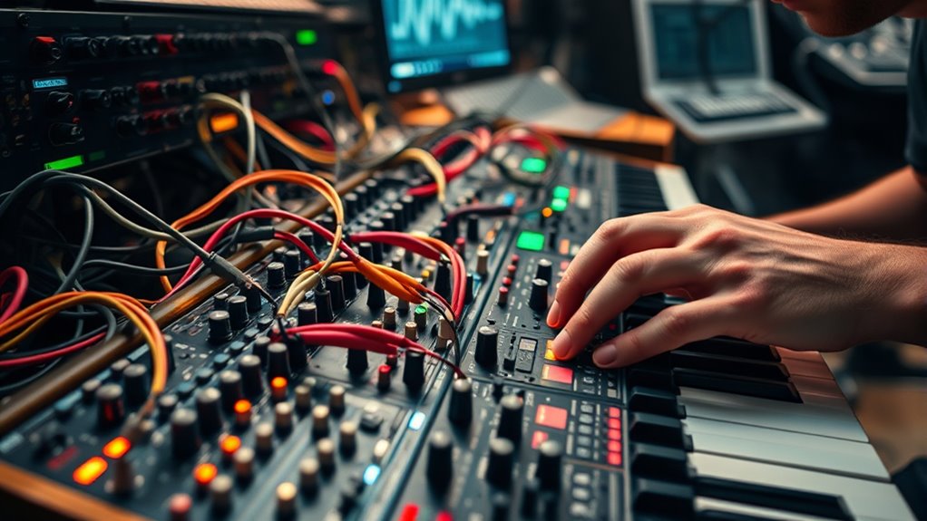 Modular synthesizers have revolutionized how musicians create and shape sound, offering endless possibilities for customization and experimentation. When you delve into patch design, you’re essentially building your own instrument from the ground up. Each module you connect influences the final sound, giving you complete control over the sonic outcome. This process of patching allows you to craft unique soundscapes by choosing how signals flow through oscillators, filters, amplifiers, and effects. You’re not limited to preset sounds; instead, you actively sculpt your tone by experimenting with different connections, making every patch a personal signature. Sound sculpting becomes a tactile experience, where you tweak knobs, patch cords, and parameters to mold your sound in real-time. This hands-on approach enables you to discover textures and timbres that are impossible with traditional synthesizers or digital instruments. The art of patch design is about understanding how each module interacts and how signal routing affects the tonal qualities and dynamics. For example, by patching an LFO to modulate a filter cutoff, you create evolving, rhythmic effects that add movement and complexity. You might combine multiple oscillators to create rich, layered sounds or route a sequencer into a filter for rhythmic gating. Every decision in patch design influences the overall character of your music, making the process highly intuitive yet deeply technical. As you become more familiar with your modular system, you develop a vocabulary of patches that can become your sonic palette. You might spend hours experimenting with different configurations, learning how subtle changes produce dramatic shifts in sound. This process encourages you to think creatively and outside the box, pushing boundaries and discovering new sonic territories. Sound sculpting with modular synths is also about responsiveness; you can respond to your musical ideas instantly by adjusting patch connections or parameters, making it a highly expressive instrument. It’s akin to painting with sound, where each patch is a brushstroke, and the connections are your palette. Over time, you’ll learn which modules complement each other best and how to craft patches that produce the desired emotional impact. Additionally, understanding synthesizer architecture can greatly enhance your ability to design complex and inspiring patches. The beauty of modular synths is that no two patches are alike, and your evolving patch library becomes a personal sonic toolkit. Whether you’re crafting ambient soundscapes, pulsating basslines, or experimental textures, patch design and sound sculpting empower you to shape every aspect of your music, turning abstract ideas into tangible, expressive sound.