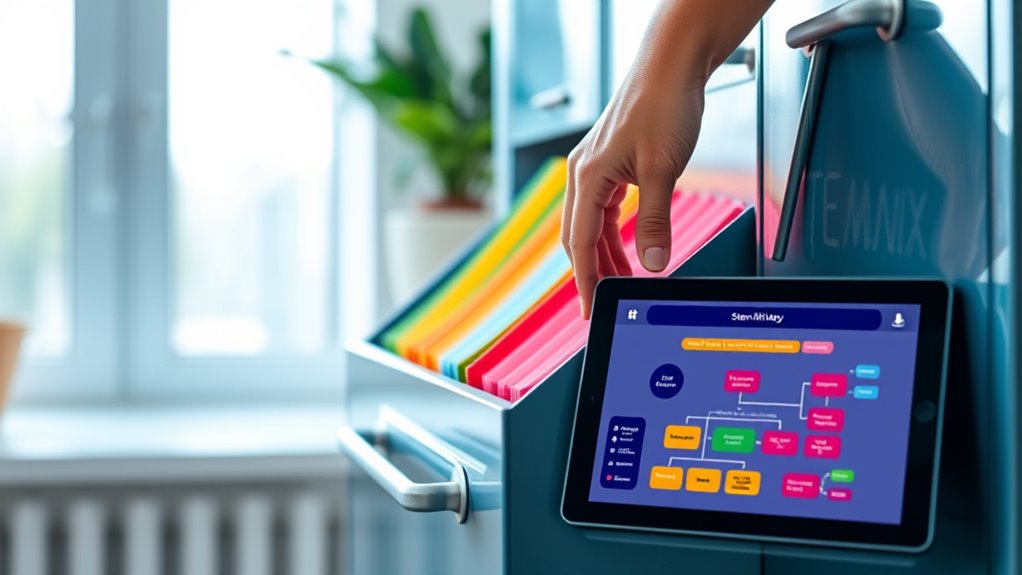 Incorporating icons and labels into your filing system instantly enhances file identification by providing visual cues that stand out. Icons quickly convey the content or purpose of a file, saving you time when searching. Use simple, recognizable symbols—like a document, image, or email icon—to represent different file types. Labels add clarity by clearly describing the file’s contents or category. Combine icons with descriptive labels for maximum impact, making it easy to distinguish files at a glance. Keep icons consistent in style to avoid confusion, and use concise labels that are easy to read. This visual approach streamlines your workflow, reduces errors, and helps you locate files swiftly, keeping your digital or physical filing system organized and efficient. Additionally, understanding the security implications of visual cues can help protect sensitive information from unauthorized access. Being aware of local neighborhood dynamics can also guide you in customizing your filing system to better suit your specific needs and environment. Properly implementing icon and label strategies can also improve system scalability as your collection of files grows over time.