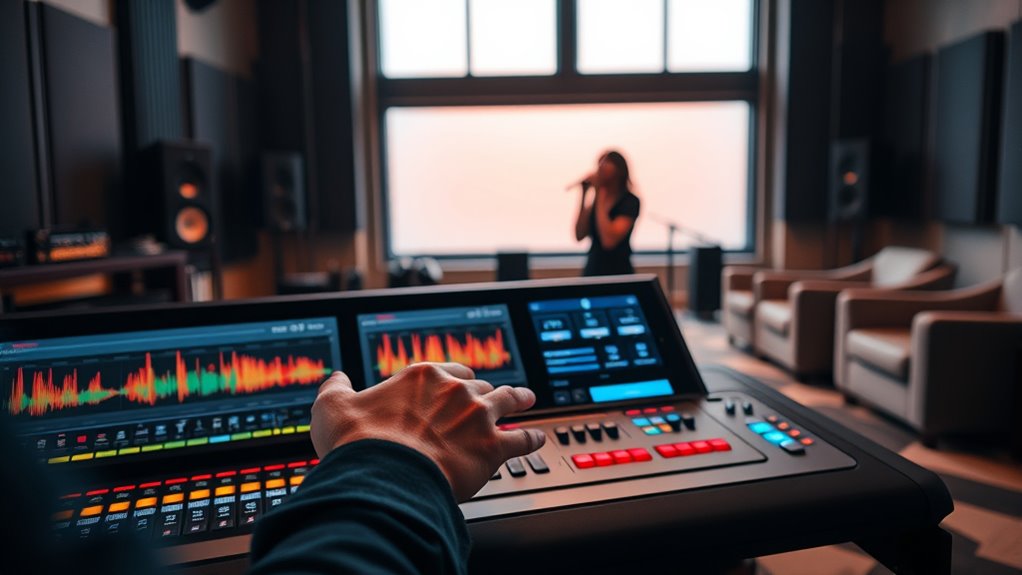 Think of your ears as a finely tuned radio, picking up subtle emotional signals. To train them, listen actively to a wide variety of vocals and focus on nuances like breath, pitch, and timing. Practice comparing takes side-by-side, noting what feels emotionally genuine. Over time, you’ll sharpen your ability to detect these delicate shifts, ensuring you preserve the raw emotion that makes a vocal performance compelling.