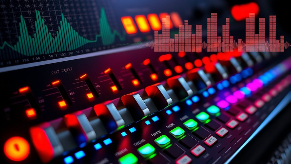 Your auditory perception shapes how you interpret the frequency spectrum, as human hearing limits your ability to detect certain frequencies. Hearing limitations mean you might miss high or low sounds, affecting your perception of timbre and EQ. This influences how you analyze audio, making it essential to contemplate these constraints when working with frequency spectrum analysis. Recognizing your hearing range helps you make more accurate adjustments and better understand sound quality.