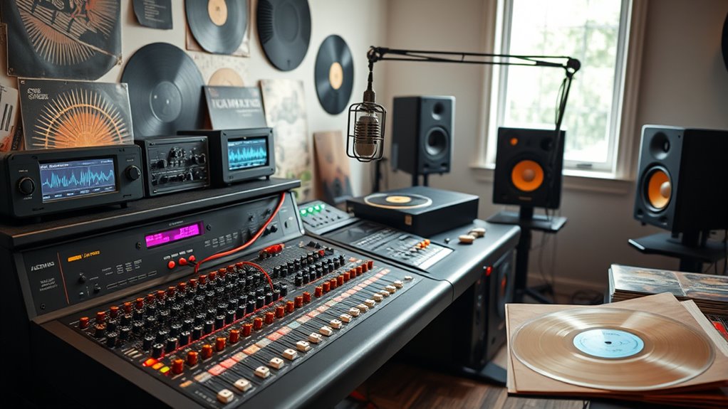 Imagine your studio as a vibrant mosaic; you can create it with budget-friendly options and DIY solutions. To keep costs low, repurpose old gear, build your own cables, or use software plugins that mimic analog warmth. Look for second-hand gear and open-source tools. These affordable strategies let you blend analog and digital seamlessly, giving your setup professional sound without breaking the bank, all while fueling your creative vision.