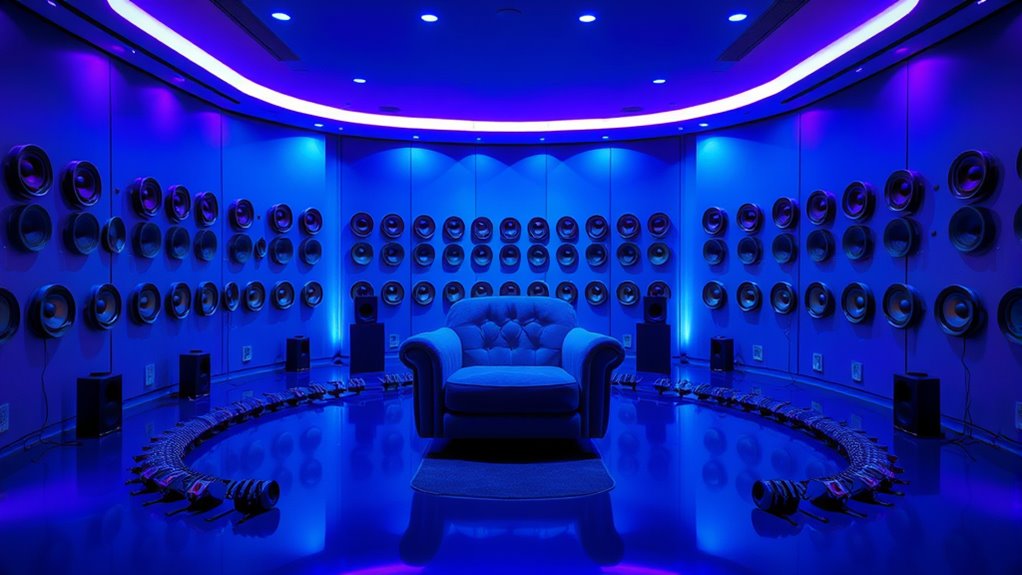 Immersive sound and spatial audio create realistic 3D soundscapes that surround you with multi-dimensional environments. Using techniques like binaural recording and holographic audio, these methods mimic natural hearing cues, making sounds seem to come from specific directions and distances. This deep sense of presence enhances emotional and sensory engagement, making you feel more connected to the scene. Keep exploring to learn how these advanced audio techniques transform your auditory experiences.