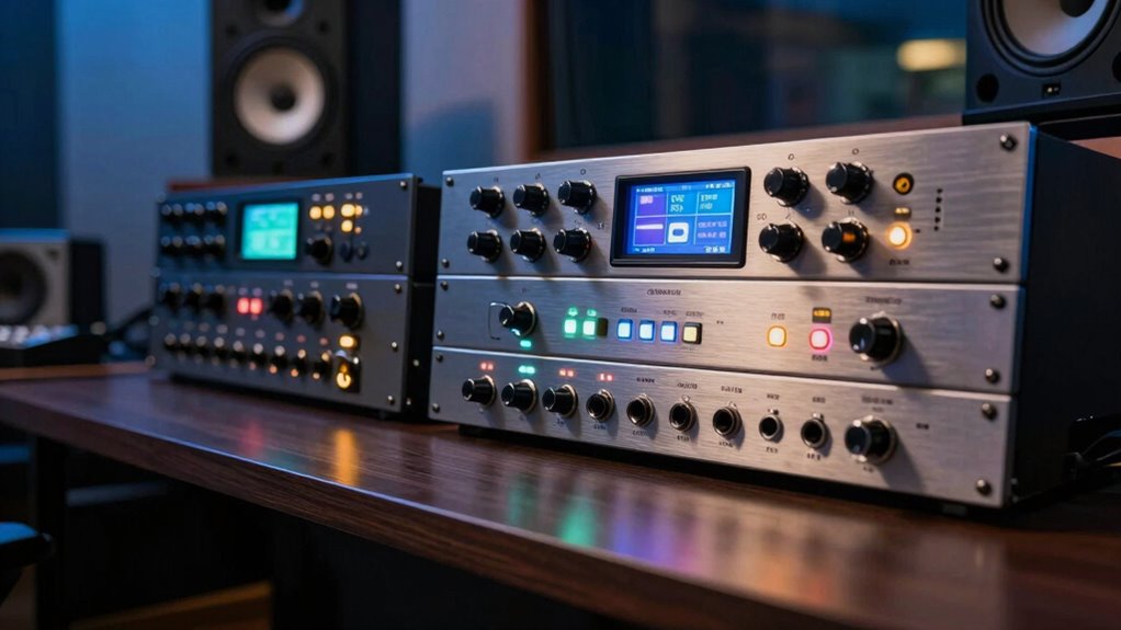 Rackmount interfaces boost your studio workflow efficiency by enhancing studio ergonomics, making equipment easier to access and manage. They streamline signal routing, reducing setup time and minimizing errors during sessions. With everything organized in a centralized rack, you can quickly troubleshoot issues and make adjustments, saving valuable time. This setup keeps your workspace tidy and functional, allowing you to focus more on creativity and less on technical hassles.