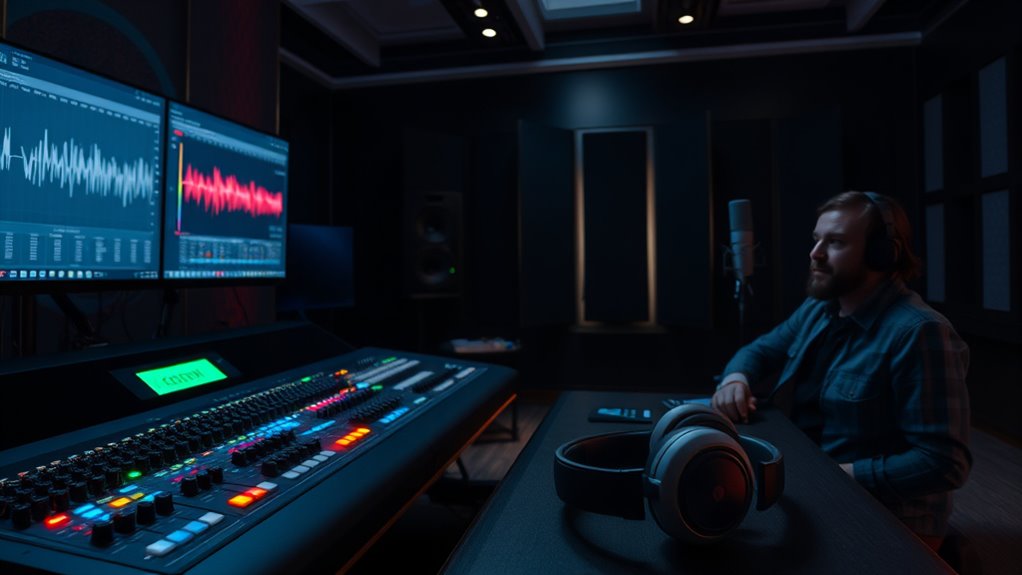 To excel in sound design for games and film, focus on blending ambient textures, character voices, and sound effects thoughtfully. Use high-quality libraries and layer sounds carefully to create realistic environments and emotional depth. Balance and sync elements with timing and spatial awareness, avoiding clutter. By mastering these techniques, you’ll craft immersive experiences that evoke emotion and tell compelling stories—so keep exploring to discover even more tips and insights.