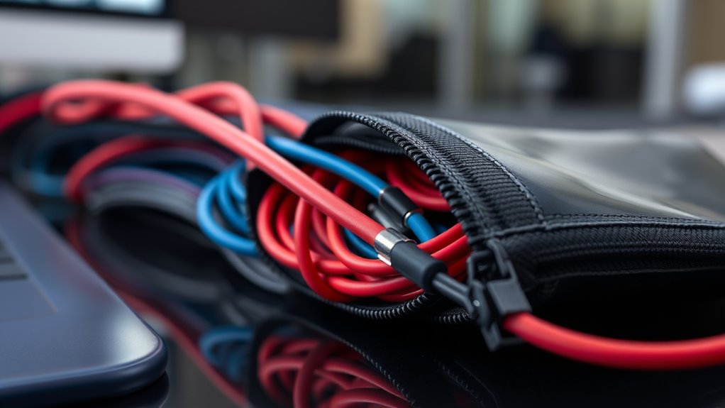 Choosing the right cable management sleeve depends heavily on its flexibility and compatibility with your cables. I look for sleeves made from flexible materials like neoprene, PET, or braided fabric, which easily mold to different cable configurations. Expandability is vital—ideally, the sleeve should stretch by 50% or more to handle various cable sizes and connector bulkiness without strain. Ensuring the diameter suits your cable bundles is essential so multiple cables of different gauges fit comfortably. I also prefer sleeves with adjustable or stretchable features, allowing easy addition or removal of cables as my setup changes. Features like zippers, hook-and-loop fasteners, or split designs make accessing and reorganizing cables straightforward, ensuring compatibility with my current and future needs.