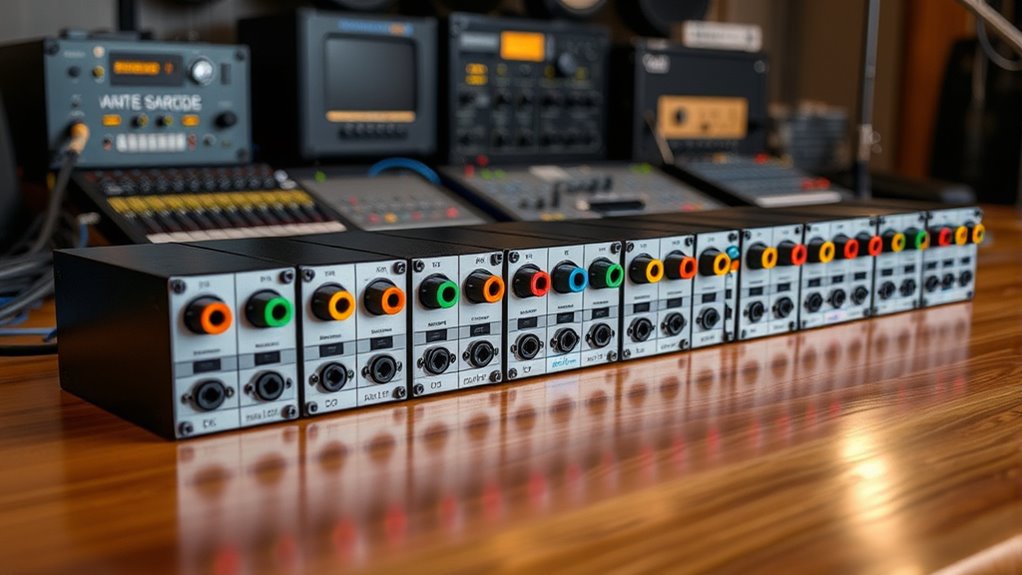 Effective noise suppression is essential for clear audio, and transformer isolation plays a pivotal role in achieving it. It helps eliminate ground loop hum and reduces electromagnetic interference, ensuring cleaner sound. Active DI boxes often incorporate circuitry designed to minimize background noise, which results in a crisper, more detailed signal. Using quality components like low-noise op-amps and high-grade transformers can markedly boost a DI box’s ability to suppress unwanted noise. Ground lift switches are also common features that help reduce hum caused by ground loops, improving overall noise performance. Proper shielding and impedance matching further lower the noise floor, helping you achieve pristine audio clarity. When choosing a DI box, prioritize these features to ensure your sound remains pure and free of distracting hums or buzzes.