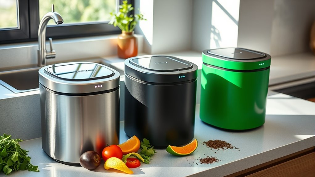 If you’re looking for the best electric compost bins for your kitchen in 2025, I recommend considering models like the Electric Kitchen Composter with 4.2L capacity for efficiency, the 4L composter with odorless and auto-clean features for convenience, and the sleek Reencle Prime Electric Composter. These options offer smart waste management, odor control, and easy maintenance, making kitchen recycling effortless. Keep exploring, and you’ll find all the details to pick the perfect fit for your needs.