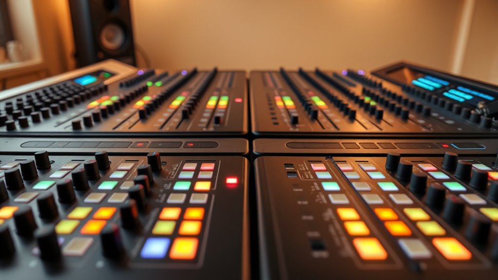 Motorized faders automatically move in sync with your DAW automation, offering precise visual feedback and making adjustments more intuitive. This feature is vital when automating complex mixes, as it keeps fader positions accurate during playback, reducing guesswork. Fixed faders, on the other hand, require manual movement and don’t reflect automation changes visually, which can slow down workflow. While motorized faders tend to be more expensive and complex, they excel in dynamic, automation-heavy environments. Fixed faders are simpler, more affordable, and less prone to mechanical issues, making them suitable for straightforward setups. If your work involves extensive automation and real-time feedback, motorized faders provide a clear advantage. For basic manual control, fixed faders are a practical, cost-effective choice.