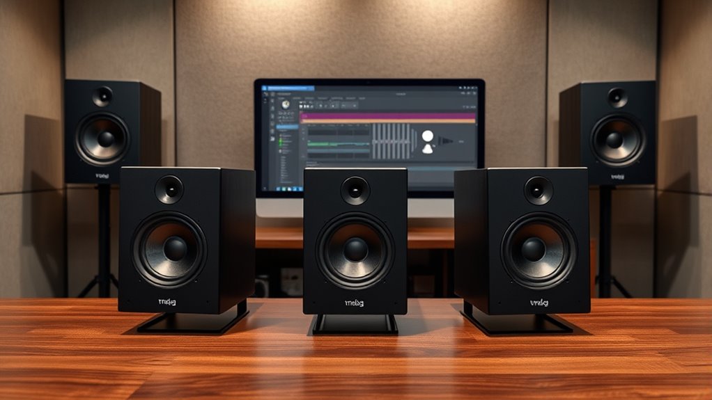 Imagine a clear, crisp lake reflecting every detail—that’s what powered monitors deliver. I find powered monitors often better for studio use because they simplify setup, with built-in amplifiers providing cleaner, more consistent sound. They’re ideal if you want a straightforward, reliable option. Passive monitors require an external amp, which can introduce variables. For ease and precision, I prefer powered monitors—they’re like a direct, unfiltered reflection of your sound.