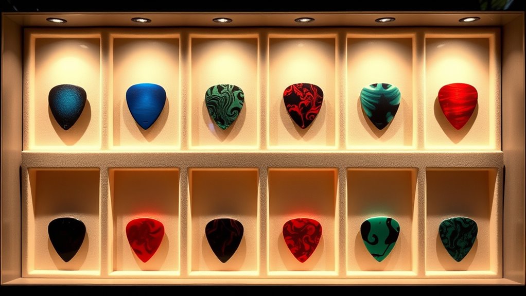 If you’re looking to showcase your favorite guitar picks in style, I recommend exploring a variety of shadow boxes and display cases. From sleek acrylic setups to handcrafted wooden holders, there are options for every taste and collection size. Think about factors like capacity, material, and ease of access. Continuing further, you’ll discover how to choose the perfect display to protect and highlight your prized picks perfectly.