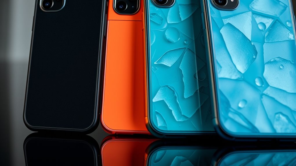 Choosing a durable iPhone 17 Pro Max case means prioritizing protection against accidents and daily wear. I look for cases with military-grade drop protection and impact resistance to guarantee my phone can handle falls. Reinforced bumpers and raised edges are essential—they shield the screen and camera from scratches and impacts. I also prefer shock-absorbing materials like TPU or polycarbonate for extra durability during impacts. To keep my device looking good, I check that the case resists scratches, smudges, and fingerprints. Reinforced port covers and secure closures are important too—they prevent dust and debris from damaging internal components. Overall, a case with these features provides reliable protection, giving me peace of mind in everyday use.