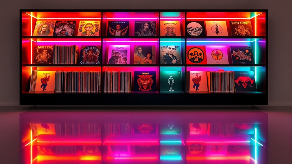 LED lights don’t harm vinyl records if used properly. They emit low heat and minimal UV rays, so they won’t cause warping or fading. I always guarantee my LEDs are energy-efficient and cool to the touch, preventing any damage. Proper placement is key—keeping lights away from direct contact with the records. With careful use, LED lighting enhances my display without compromising my collection’s preservation.