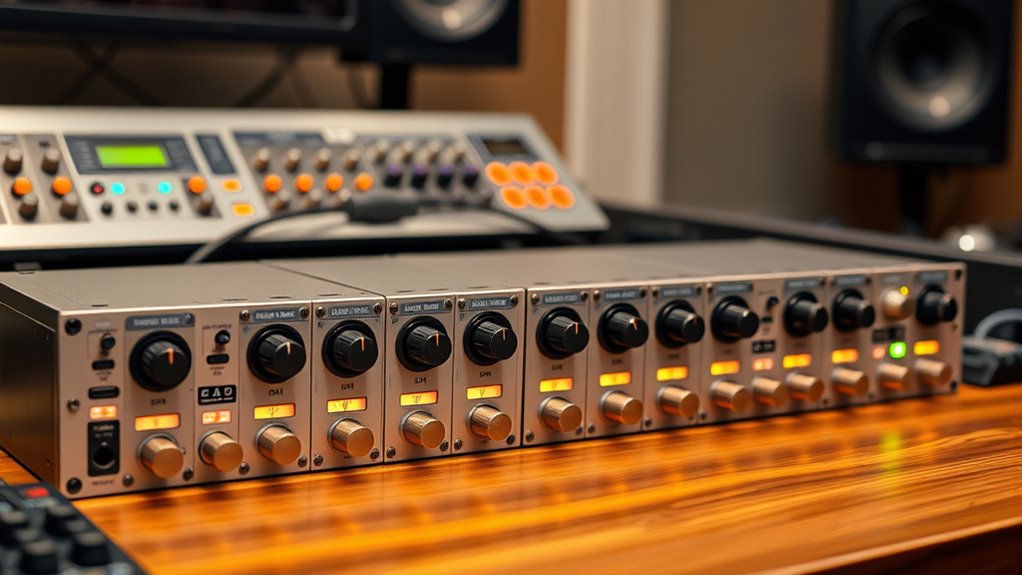 Choosing a mic preamp with a low noise floor is essential for capturing clean, detailed recordings. A lower noise floor means less background hiss and static, resulting in clearer sound. Professional preamps often have a noise floor below -100dB, ensuring high fidelity even with quiet sources. The noise floor directly impacts the dynamic range; a higher level reduces your ability to record subtle nuances accurately. When selecting a preamp, compare its specified noise floor to your recording environment’s sensitivity needs. Keep in mind that ambient noise and cable quality can influence the effective noise level, so it’s important to weigh your setup as a whole. Prioritizing a low noise floor helps you achieve the pure, professional sound you’re aiming for.