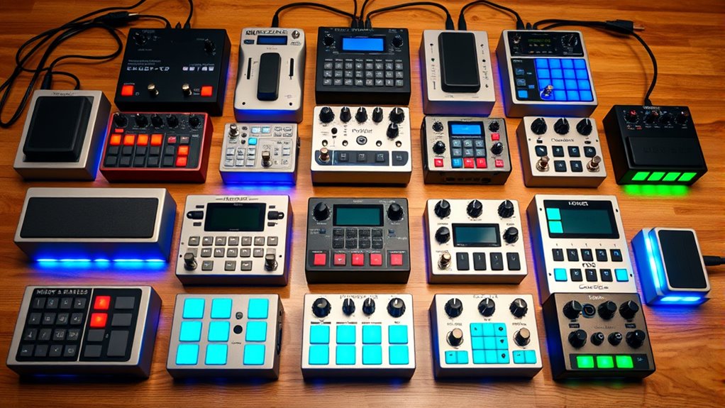 Programmable MIDI foot controllers integrate smoothly with various DAWs by connecting via USB or MIDI cables. I simply assign specific footswitches to control functions like play, stop, or track effects within my DAW’s settings. Most controllers are compatible out of the box or through custom mappings, making it easy to switch between different software. This flexibility lets me perform seamlessly, boosting my workflow without hassle.