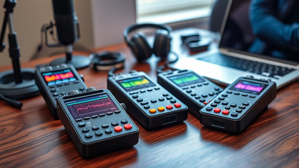 Think of your recording setup as a stage—every accessory adds to the performance. I recommend investing in quality microphones, like shotgun or lavalier mics, to capture clear sound. A sturdy windscreen helps outdoors, and good headphones let you monitor in real-time. Also, consider portable power banks for extended sessions and protective cases to keep your gear safe. These accessories truly elevate your portable recording game.