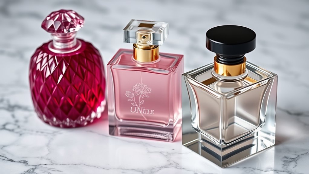 When it comes to carrying your favorite perfume on the go, packaging and portability become key considerations. I look for bottles that are lightweight and easy to slip into my bag or pocket without hassle. Travel-sized options, usually between 15ml and 20ml, are perfect—they’re compact and fit comfortably in my hand. I also check that the packaging is sturdy and leak-proof, so I don’t worry about spills or damage during travel. A sleek, discreet design makes reapplication effortless throughout the day, whether I’m at work or out for a night. It’s essential that the container preserves the fragrance’s quality, preventing evaporation or contamination. Good packaging guarantees I can enjoy my signature scent wherever I go without sacrificing convenience or fragrance integrity.