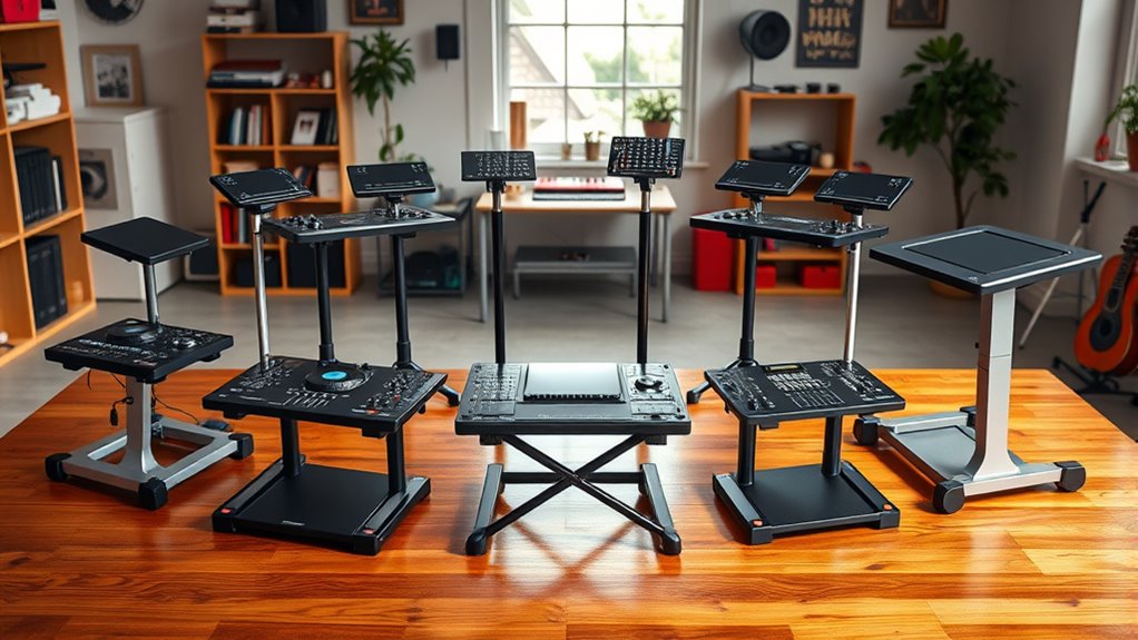 When selecting a portable lapstand, I consider factors like adjustability range to match my setup, device compatibility to guarantee everything fits, and portability features for easy transport. I also look at stability and support to keep my equipment secure and build durability for long-term use. These points help me find a lapstand that’s reliable, versatile, and convenient for my DJ gigs.
