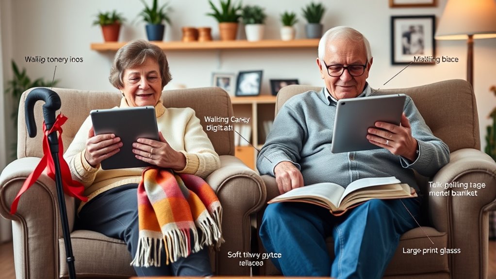 Ensuring comfort and proper fit is essential when choosing practical gifts for my elderly parents, as these factors directly affect their daily well-being. I look for items with adjustable features or stretchable fabrics that accommodate aging skin and sensitive areas. Ergonomic designs, like handles with non-slip grips or easy-to-wear clothing, help reduce strain and make daily activities easier. Soft, hypoallergenic fabrics are a priority to prevent skin irritation during prolonged use. When selecting accessories, I pay attention to sizing guidelines to make certain they aren’t too tight or loose, considering age-related changes in body measurements. Additionally, I consider the weight and coverage of items like weighted blankets or supportive cushions, making sure they promote relaxation without causing discomfort or pressure.