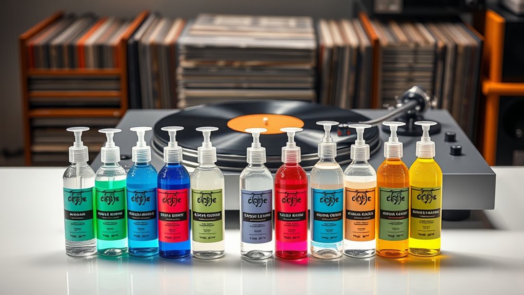 Looking to keep your vinyl collection spotless in 2025? I recommend exploring top refill options like Big Fudge’s 4-in-1 system, Impresa’s spray refills, and the eco-friendly Vinyl Record Cleaning Solution Fluid. For larger collections, GrooveWasher’s 32 oz refill or OPULA’s smaller solution work great. The Mobile Fidelity cleaning fluid and Discwasher refills also stand out. Keep your records sounding perfect—and if you continue, you’ll discover tips on choosing the best solutions for your needs.