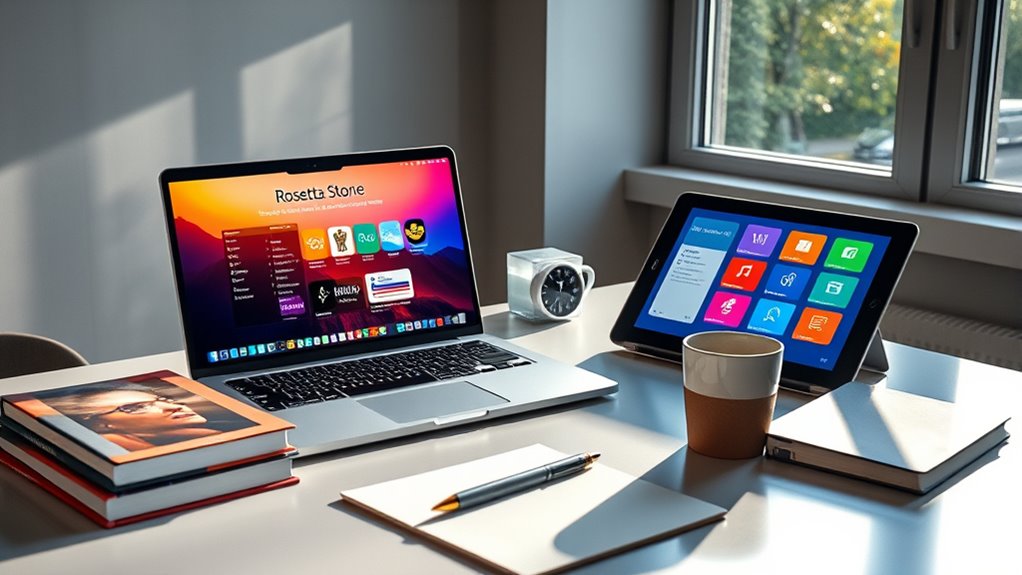 To make the most of a Rosetta Stone lifetime deal, it’s vital to guarantee the platform works smoothly across all the devices I plan to use. I need to confirm the subscription supports my PC, Mac, iOS, and Android devices for seamless access. Checking if the platform offers apps or web-based options compatible with my preferred operating system is crucial. If I plan to learn on my smartphone or tablet, I want the software to be optimized for mobile devices. I also verify the system requirements for desktop versions to avoid compatibility issues with my hardware or OS updates. Additionally, cross-platform synchronization features are a big plus, allowing me to save my progress and pick up right where I left off, no matter which device I use.