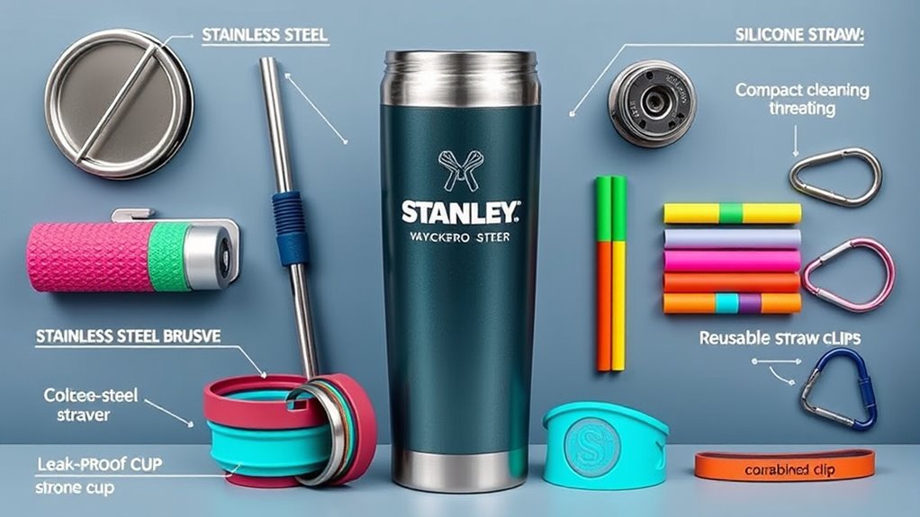 If you want to boost your hydration game, I recommend exploring some of the best Stanley tumbler accessories. Things like silicone straw toppers, reusable stainless steel straws, impact-absorbing silicone aural protectors, and decorative charms can enhance hygiene, durability, and style. Seasonal options like holiday-themed sets also add fun. Choosing the right accessories depends on your needs, but there are plenty designed to make your tumbler more functional and personalized. Keep going for all the details.