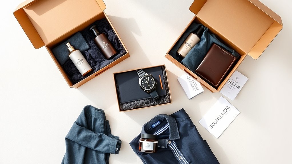 Considering customization options can considerably enhance the value of a men’s subscription box, as it allows you to tailor the gift to the recipient’s tastes and interests. Many services offer personalized messages, gift wrapping, or the ability to select specific themes, making the box more meaningful. You can often choose preferred snack types, clothing sizes, or hobby-related items, ensuring the contents match their passions. Some subscriptions let you adjust the length or pause deliveries, adding flexibility. Keep in mind, more personalized options might cost a bit extra or include premium features. Clear communication about customization options helps ensure the recipient gets a gift that truly aligns with their preferences, making it more appreciated and memorable.