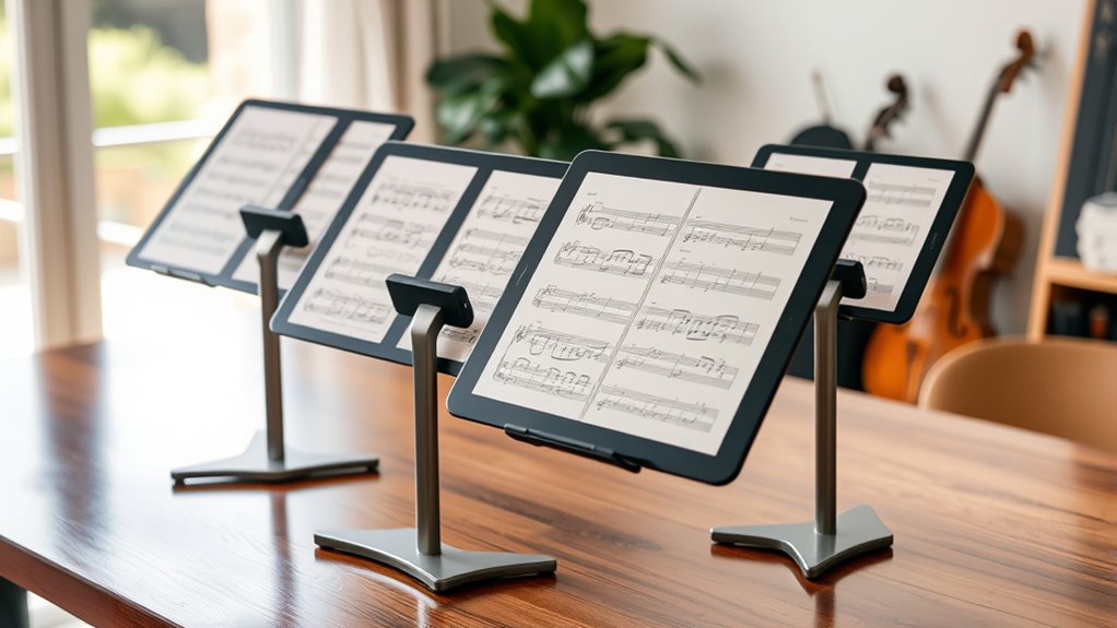 A stable tablet sheet-music stand is essential for a smooth playing experience, as it prevents wobbling and accidental tipping that can disrupt your performance. Look for stands with a wide, heavy base or tripod legs equipped with non-slip rubber feet to keep the stand steady. Support mechanisms like spring-loaded arms or adjustable clamps help secure your device firmly, minimizing wobble and movement. Adjustable height and tilt features allow you to find the perfect position for balance and comfort, reducing strain and ensuring stability during play. Materials such as heavy-duty metal or reinforced plastic enhance strength and durability, supporting your device over time. Proper weight distribution and a low center of gravity are *vital* to prevent tipping, especially during adjustments or vigorous movements.