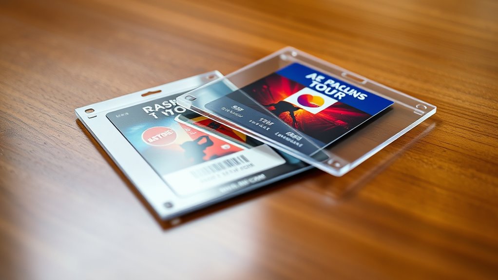Imagine slipping your tour pass into a sturdy laminate holder, watching it snap into place like a protective shield around your credentials. These holders keep your passes safe from spills, tears, and everyday wear, all while remaining visible and easy to access. With the right choice, your passes stay pristine, like a badge of honor on your chest. Investing in quality laminate holders guarantees your tour experience stays smooth, safe, and worry-free from start to finish.