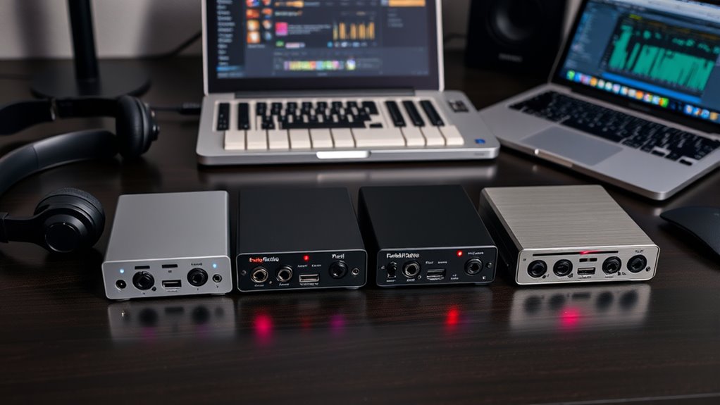 When choosing a USB audio interface under $200, I focus on connectivity options, audio quality, and device compatibility to guarantee it meets my needs. I also consider built-in features, portability, and durability since those impact my workflow and mobility. Understanding these factors helps me pick an interface that balances performance and value.