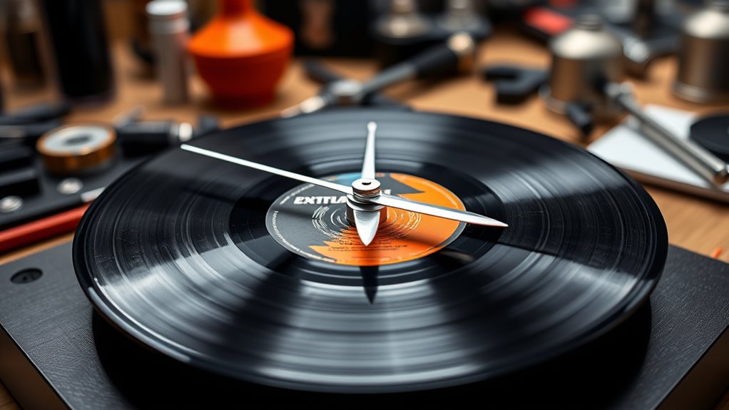 Different clock mechanisms can impact the sound quality of your record, especially if the motor produces vibrations or noise. I’ve noticed that quartz movements tend to be quieter and more stable, preserving the record’s sound better. Conversely, mechanical or older vintage mechanisms might introduce more vibrations, which can distort the sound or cause unwanted noise. So, choosing a quiet, high-quality movement helps keep your record’s audio pristine.