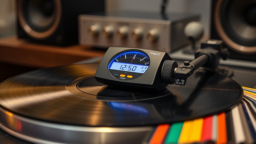 Choosing a vinyl stylus force gauge with high measurement accuracy is essential for proper cartridge setup and record preservation. An accurate gauge, typically with ±0.01g precision or better, ensures you can fine-tune tracking force precisely. The measurement range should cover the standard 1.25g to 4g, accommodating various cartridge specifications. Digital gauges with fine graduations, like 0.01g, allow for subtle adjustments that greatly improve playback quality and record lifespan. External factors such as stylus height, alignment, and vibrations can affect accuracy, so minimizing these influences is critical during measurement. Additionally, calibration weights included with the gauge or recommended for use should be highly precise and compatible with the device’s range. This attention to accuracy and range ensures reliable, consistent calibration for top-quality sound and record care.