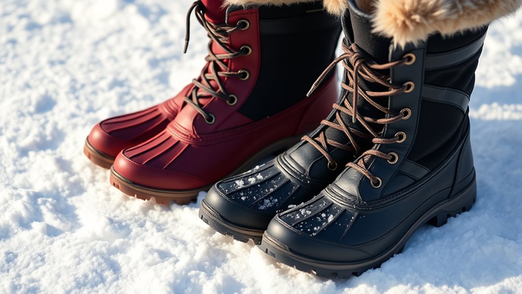 Choosing the right waterproof material is essential because it directly affects how well your snow boots keep your feet dry and comfortable. High-quality options like Gore-Tex, waterproof leather, or injection-molded rubber effectively block water while allowing moisture to escape, preventing sweaty feet. The waterproof layer should be seamlessly integrated or sealed at seams to prevent leaks during heavy snow or rain. Durable materials are often reinforced with treatments or coatings that enhance longevity and moisture resistance. Keep in mind, the waterproof material also impacts the boots’ weight and flexibility, influencing comfort and ease of movement. Properly tested waterproof footwear maintains its protective qualities even after exposure to wet conditions, ensuring your feet stay dry and warm throughout winter adventures.