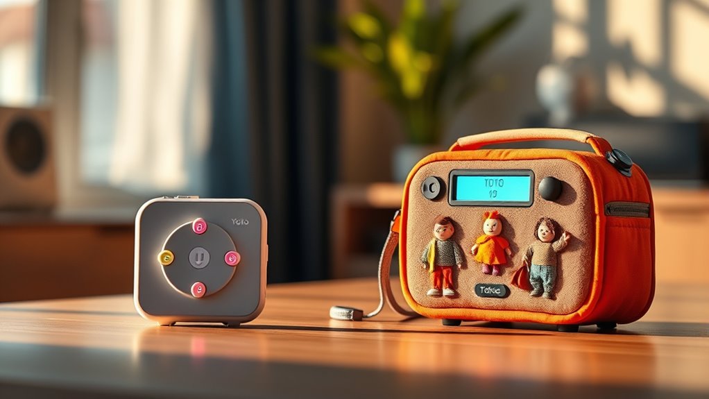 Parental control options play a crucial role in ensuring children access appropriate content and use their devices safely. When comparing Yoto Player and Toniebox, I consider how each handles these controls. Some devices offer app-based management, giving parents easy access to filter content, set time limits, and activate sleep timers. Others provide physical controls, which can be straightforward but less flexible. Many platforms also allow parents to monitor usage and restrict access to specific content through dedicated apps, ensuring age-appropriate material. The ability to approve or customize content libraries markedly boosts confidence in device safety. Ultimately, the strength and ease of these parental controls heavily influence how comfortable I feel letting my child use the device, making this a key factor in my decision.